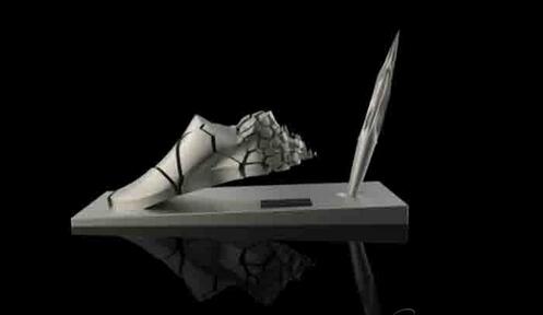 隨著3D打印的出現(xiàn)以及被廣泛應(yīng)用,一大批優(yōu)秀的設(shè)計師將一件件極具藝術(shù)美感的設(shè)計作品精確形像地還原于觀眾的視線。這件極具藝術(shù)設(shè)計感的跑鞋臺牌作品是國內(nèi)著名的美女設(shè)計師宋波紋設(shè)計的一款商務(wù)禮品,鞋子的造型表達(dá)的是關(guān)于速度,在奔跑的時候產(chǎn)生形象延時的感覺,裂變的重復(fù)排列讓鞋子帶有一定的力量感。而整體形象是一個動態(tài)的靜幀,動靜結(jié)合,讓小雕塑穩(wěn)重、生動。