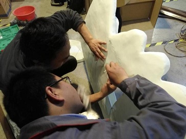 組裝也不是那么輕松的黏在一起就行了的,我們要考慮到最終的效果和在運輸過程之后絕對的安全,我們先做了一個鋼結構支架,然后將這數十個模塊固定到支架上去。利用數模分割是設置的鏈接結構和強力膠水,完成拼接組裝,最后修復表面的縫隙。
