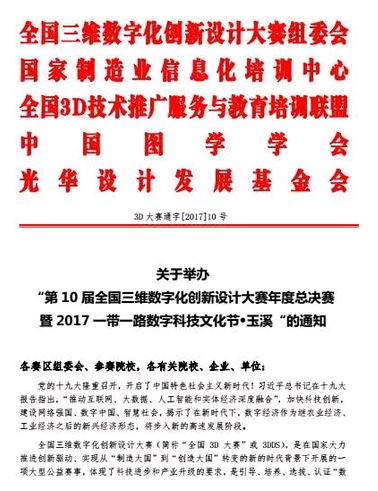 第10屆全國(guó)三維數(shù)字化創(chuàng)新設(shè)計(jì)大賽年度總決賽暨2017一帶一路數(shù)字科技文化節(jié)定于2017年12月6日至12月9日在云南省玉溪市盛大舉辦。“數(shù)造杯”數(shù)字化創(chuàng)意設(shè)計(jì)與智能制造(3D打印)大賽作為主活動(dòng)之一,將于12月6日-12月9日同期舉行。現(xiàn)將相關(guān)活動(dòng)具體安排通知如下: